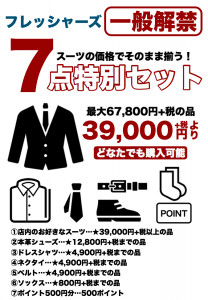 さて、今回はフレッシャーズの方限定で開催しております、スーツの価格でそのまま全て揃うおトクなフレッシャーズ限定7点セット!が、3月末までの期間限定で誰でも購入可能な一般解禁7点セットに!