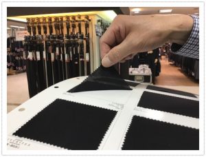 ちなみにこちらの写真は、③の清涼生地を島田次長にお願いして透け感具合をチェックしていただきました。今回は右手のみの出演となっております。