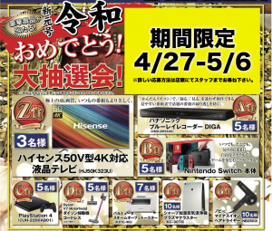 4/27〜5/6までの期間中、BIG M ONEでお買い物されたお客様対象で、素敵な商品が当たる大抽選会を開催いたします!