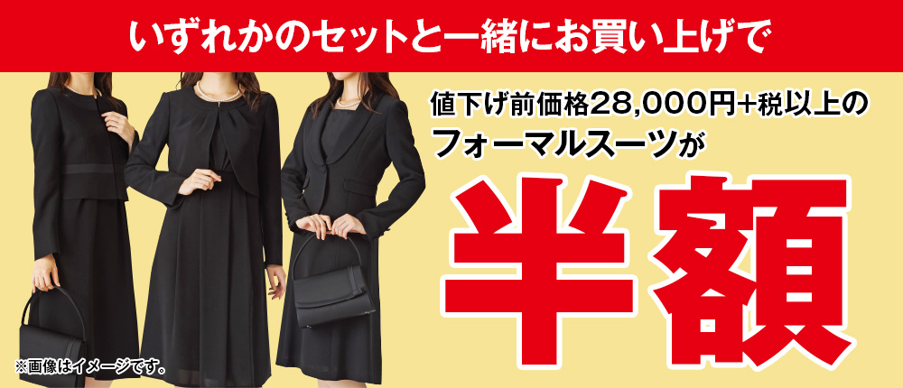 いずれかのセットと一緒にお買い上げで、フォーマルスーツ(28,000円+税以上の品)半額!